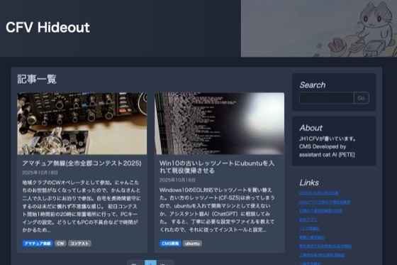 そんな感じで何日かかけて機能追加とデバッグをして、一応のリリースまでできたのが[CFV Hideout](https://cfv.sumomo.ne.jp)。今のところ静的ジェネレータ方式なので、コメント機能などはないけれど、その分セキュリティ的に強固だし、システム依存性も低い。記事の書きやすさはまだ改善の余地ありだけど、こういうのは走りながら良くしていけばいいかな。